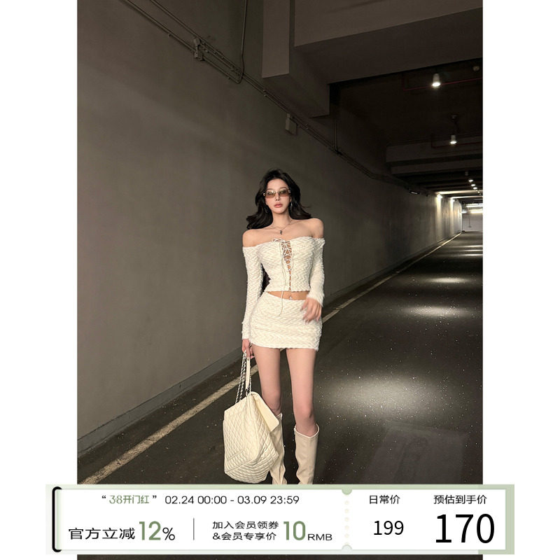 灰尘邓邓 辣妹针织套装女2026早春新款一字肩性感上衣短裙两件套