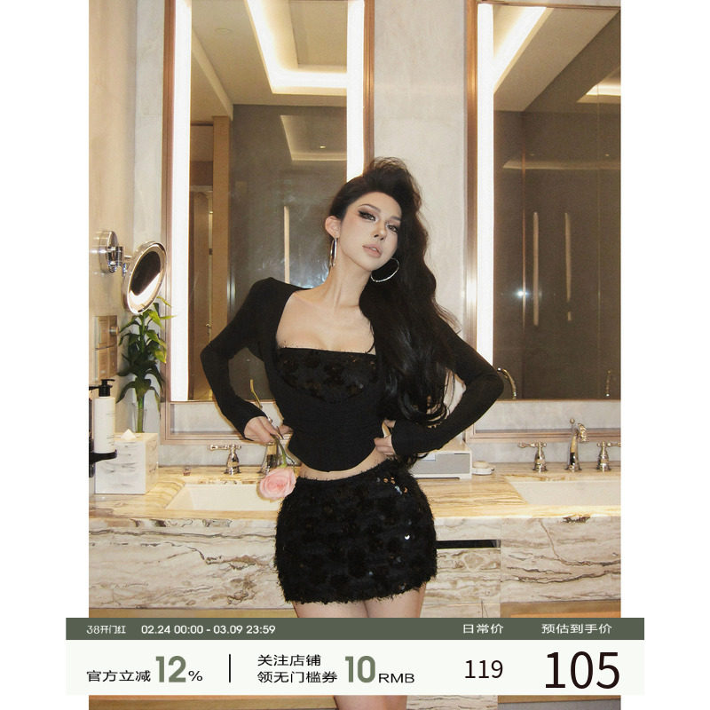 性感辣妹套装裙女秋季设计感黑色蕾丝鱼骨长袖上衣包臀皮裙短裙子