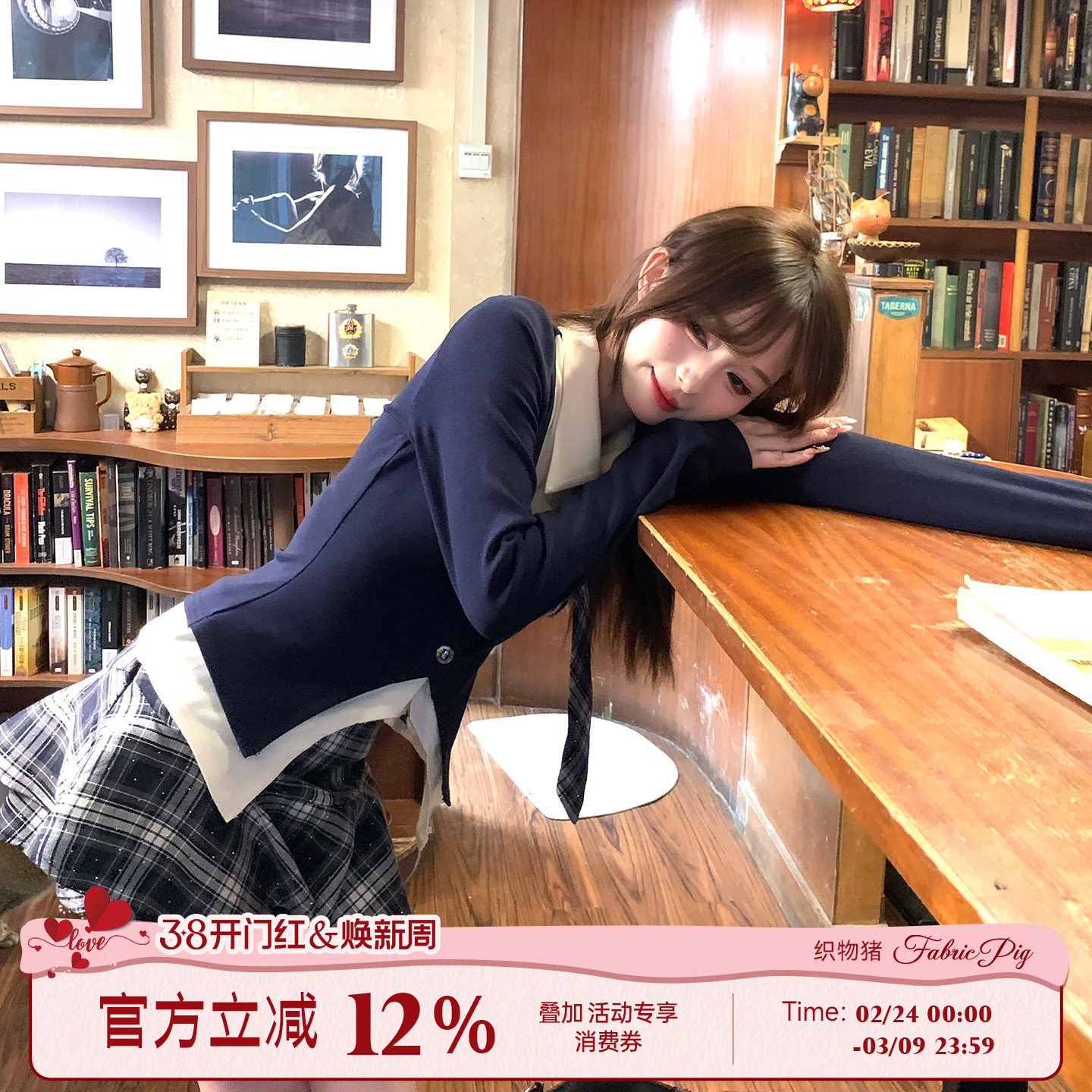 织物猪 薄荷汽水 韩系学院风短裙套装女春jk制服假两件上衣两件套