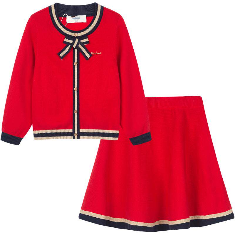水孩儿童装两件套裙子上衣女童套装学院风针织套裙女孩短裙新年红