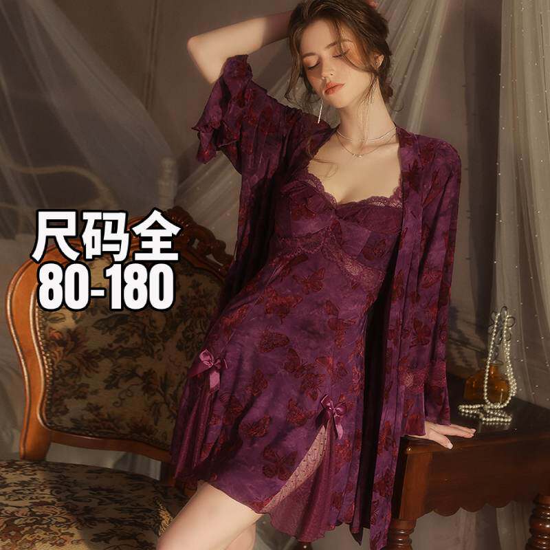 粉色带胸垫睡裙女特大码300斤纯欲风性感吊带+外袍睡衣冰丝家居服