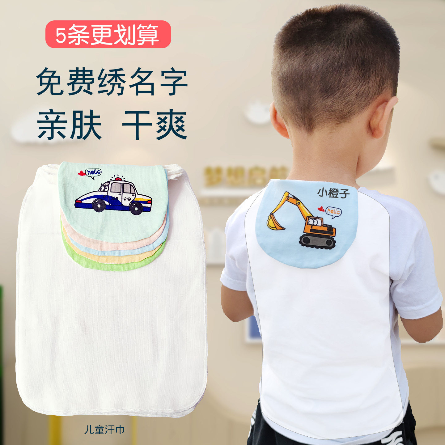 儿童汗巾纯棉夏季婴儿隔汗巾a类幼儿园吸汗巾宝宝垫背全棉绣名字