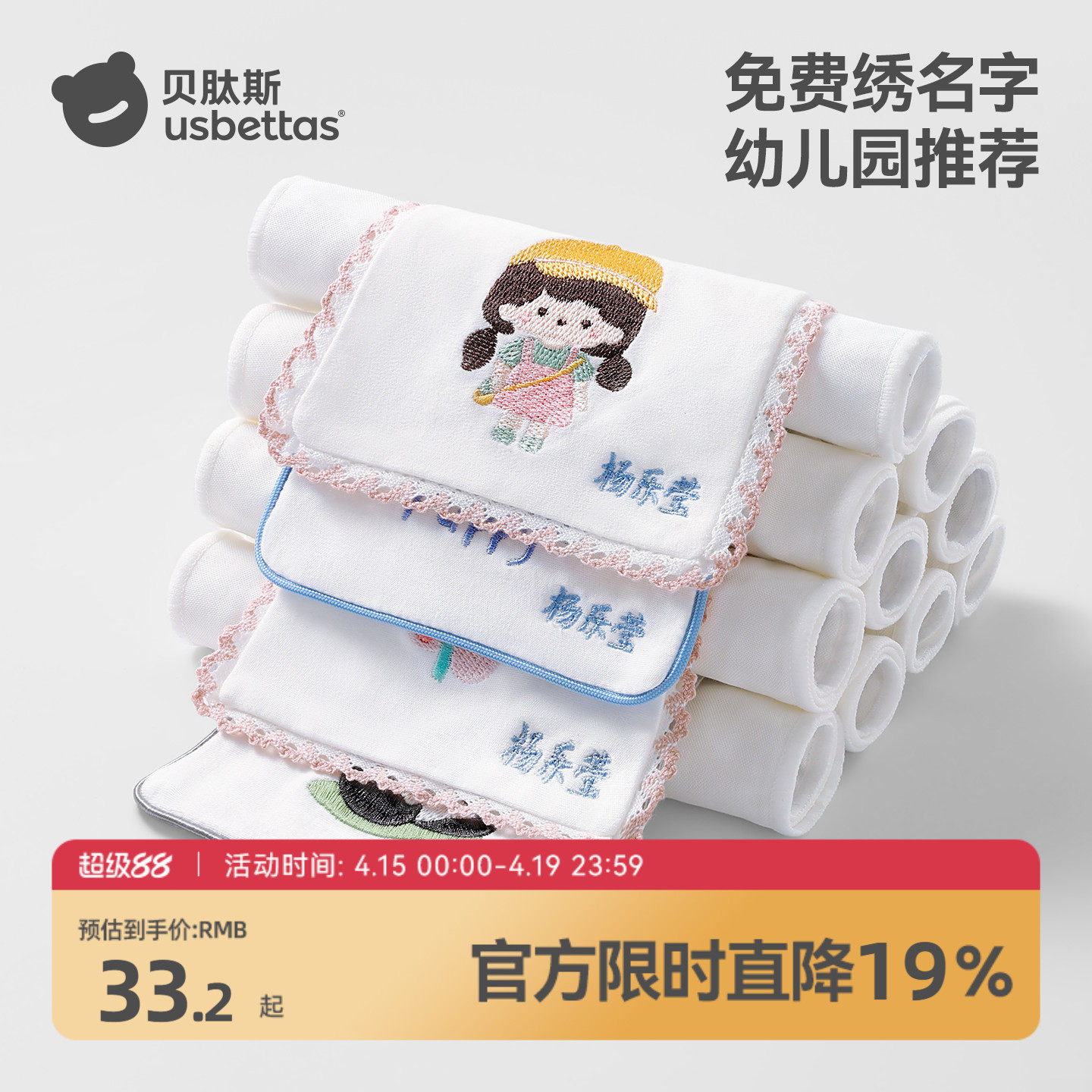 贝肽斯儿童吸汗巾幼儿园绣名字a类纯棉婴儿宝宝隔汗巾大号垫背巾