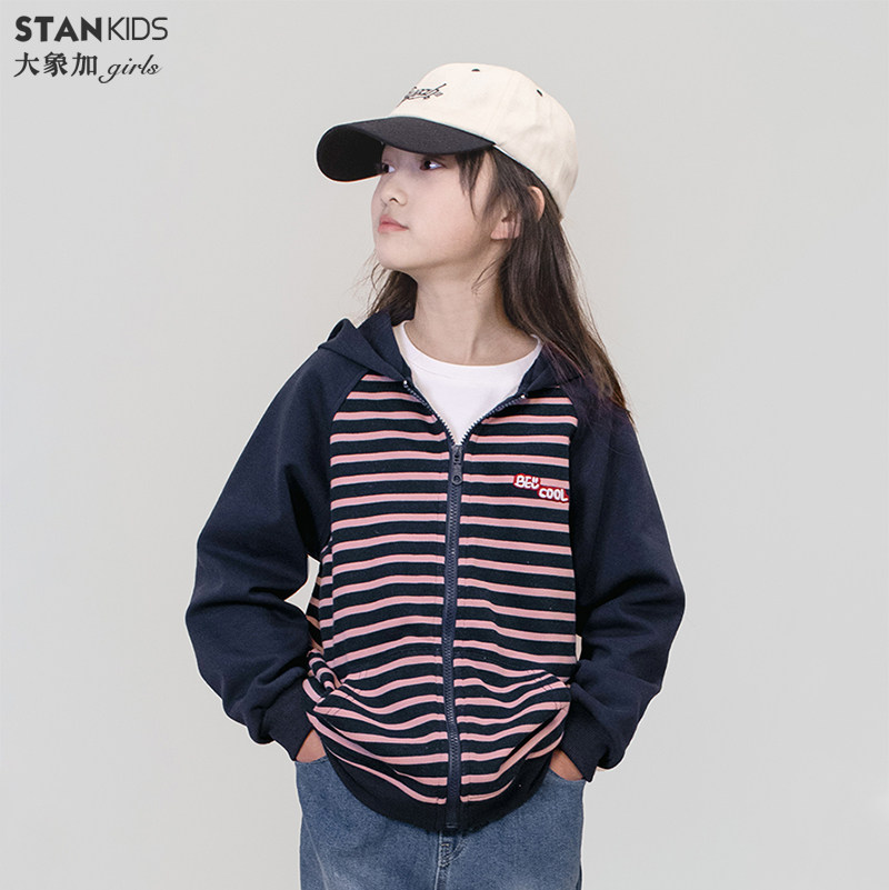 女童洋气条纹连帽拉链外套中大儿童百搭卫衣外套2025春秋中小学生