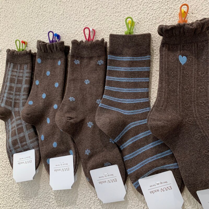 韩版网红冬季新款咖色女袜美拉德加厚保暖条纹波点爱心羊绒中筒袜