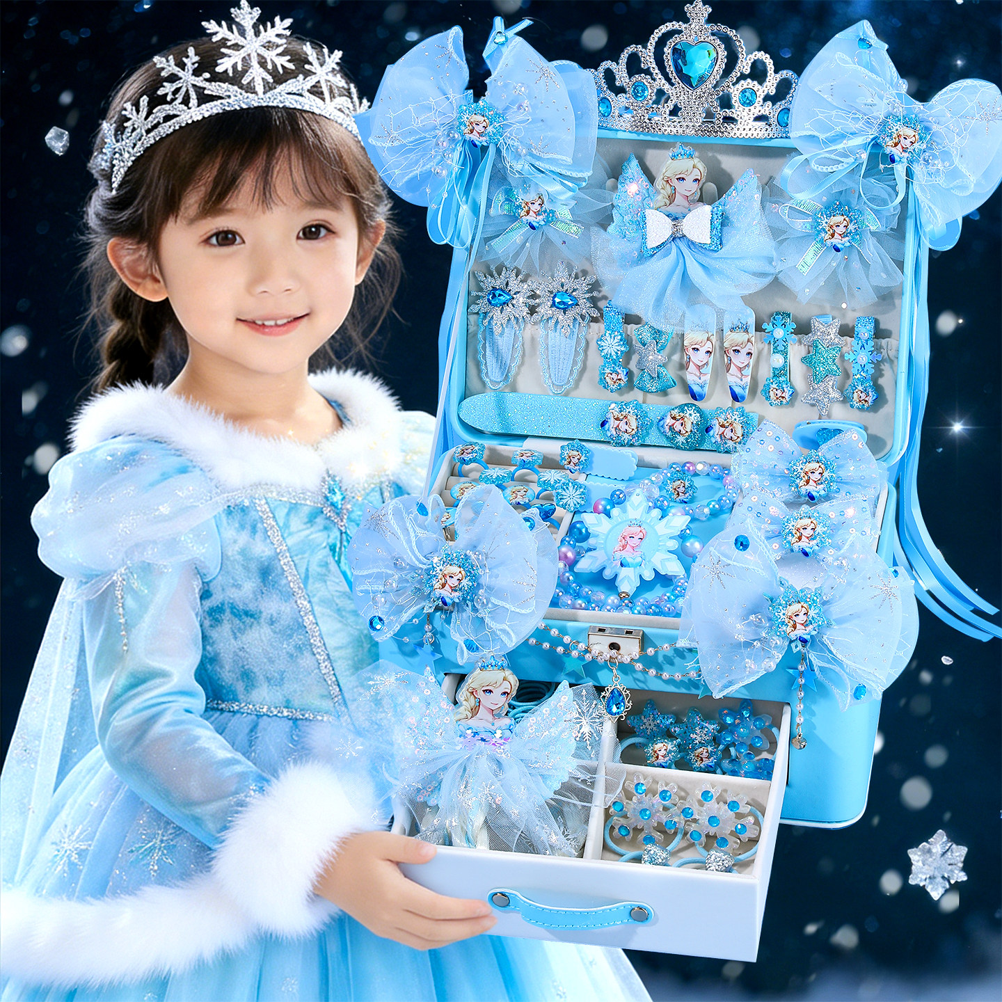 迪士尼冰雪奇缘儿童发饰礼盒艾莎公主首饰盒发夹女孩礼物头饰套装