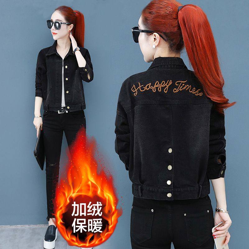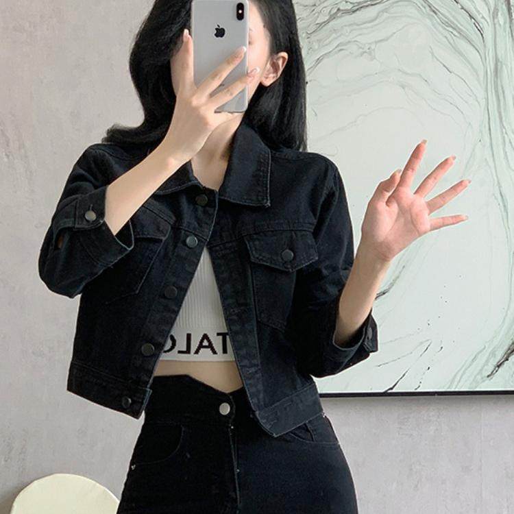 牛仔外套女春秋短款韩版新款修身显瘦九分长袖大码牛仔服上衣黑色