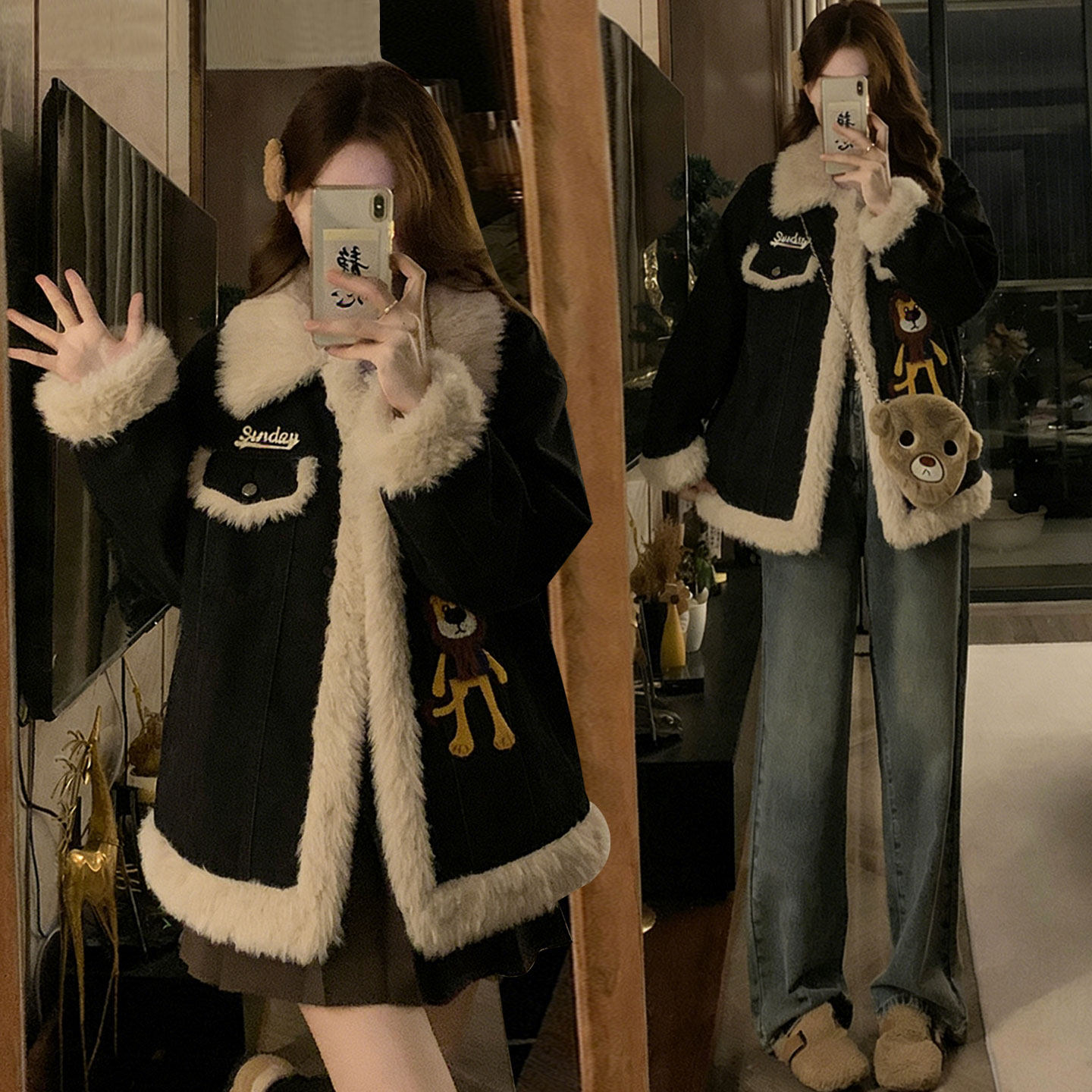 300斤特大码胖mm羊羔毛牛仔外套女韩版宽松学生黑色加绒加厚棉服