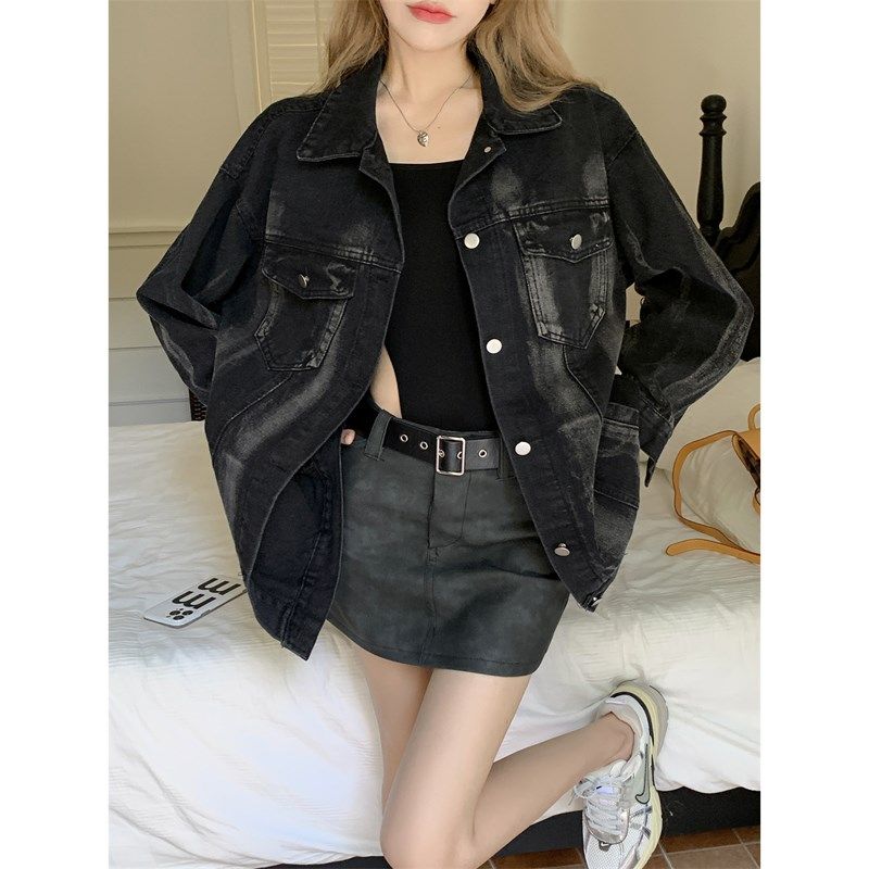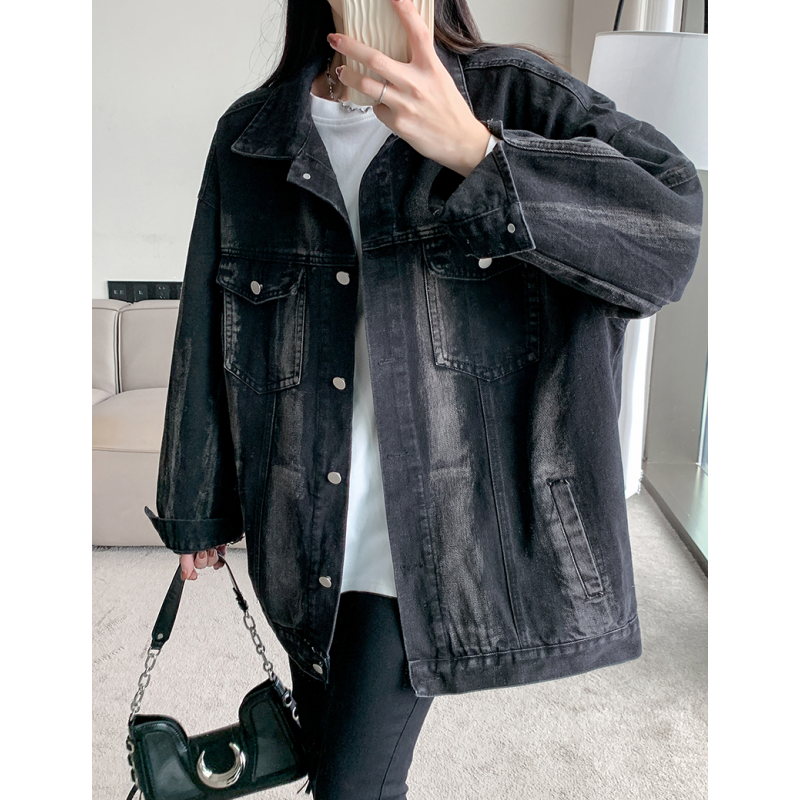 复古黑色水洗牛仔外套女春秋季韩版百搭新款ins宽松减龄上衣夹克