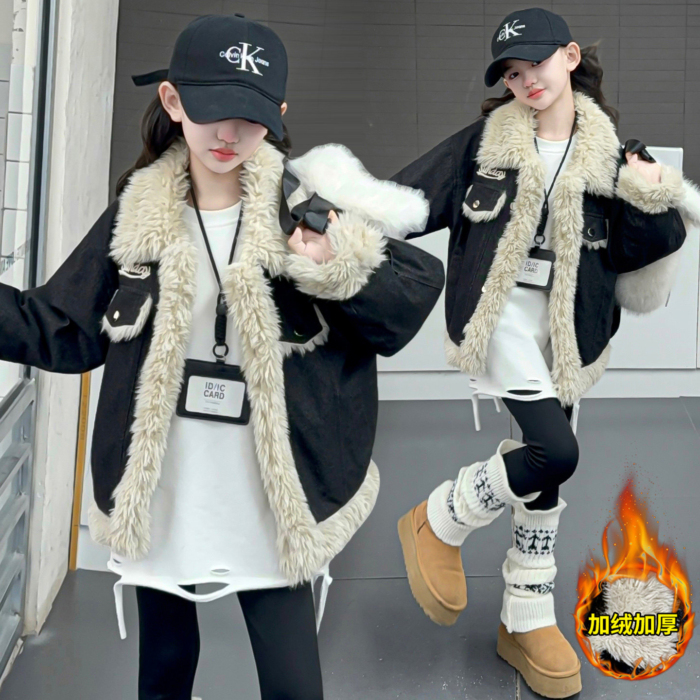 女童冬款加棉牛仔外套2025新款中大童韩版加厚拼接黑色牛仔外套潮