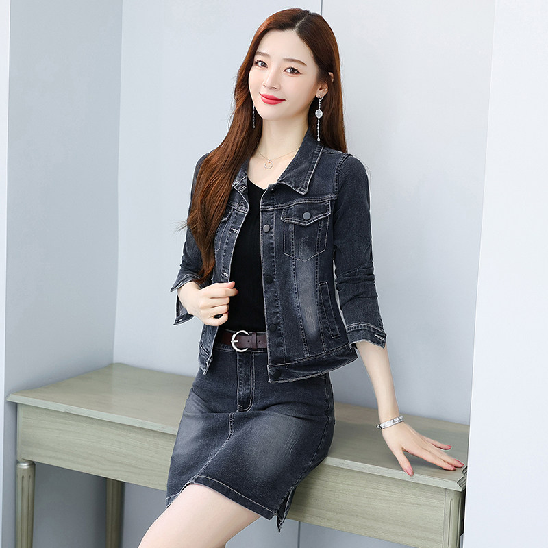 黑色牛仔裙套装女2023s春秋新款韩版修身显瘦短外套短裙套装两件