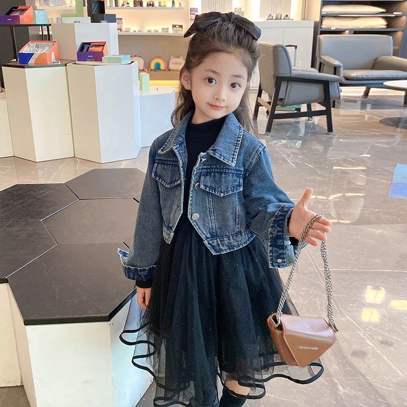 女童秋季套装2024新款韩版洋气黑色连衣裙儿童秋装牛仔外套春装