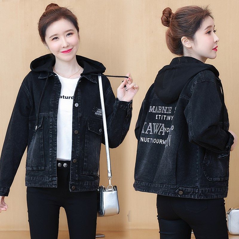 2021春秋季装新款韩版中长款连帽黑色牛仔外套时尚印花休闲风衣女