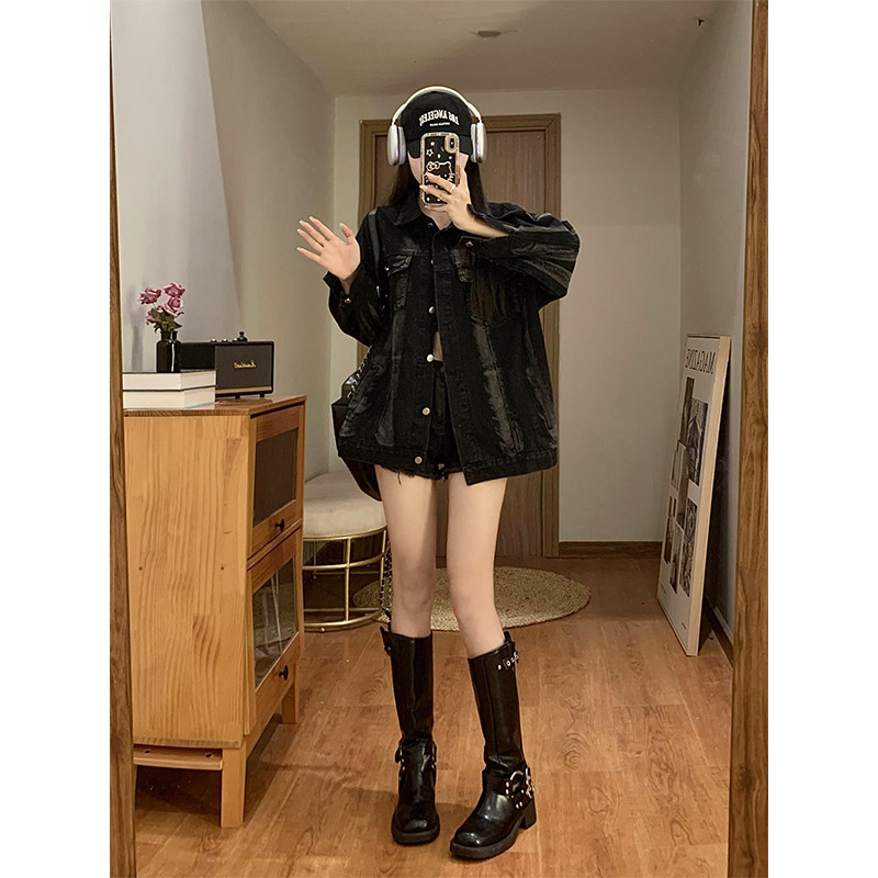 黑色牛仔外套女2025春新款韩版宽松大码工装中长款上衣褂子潮酷