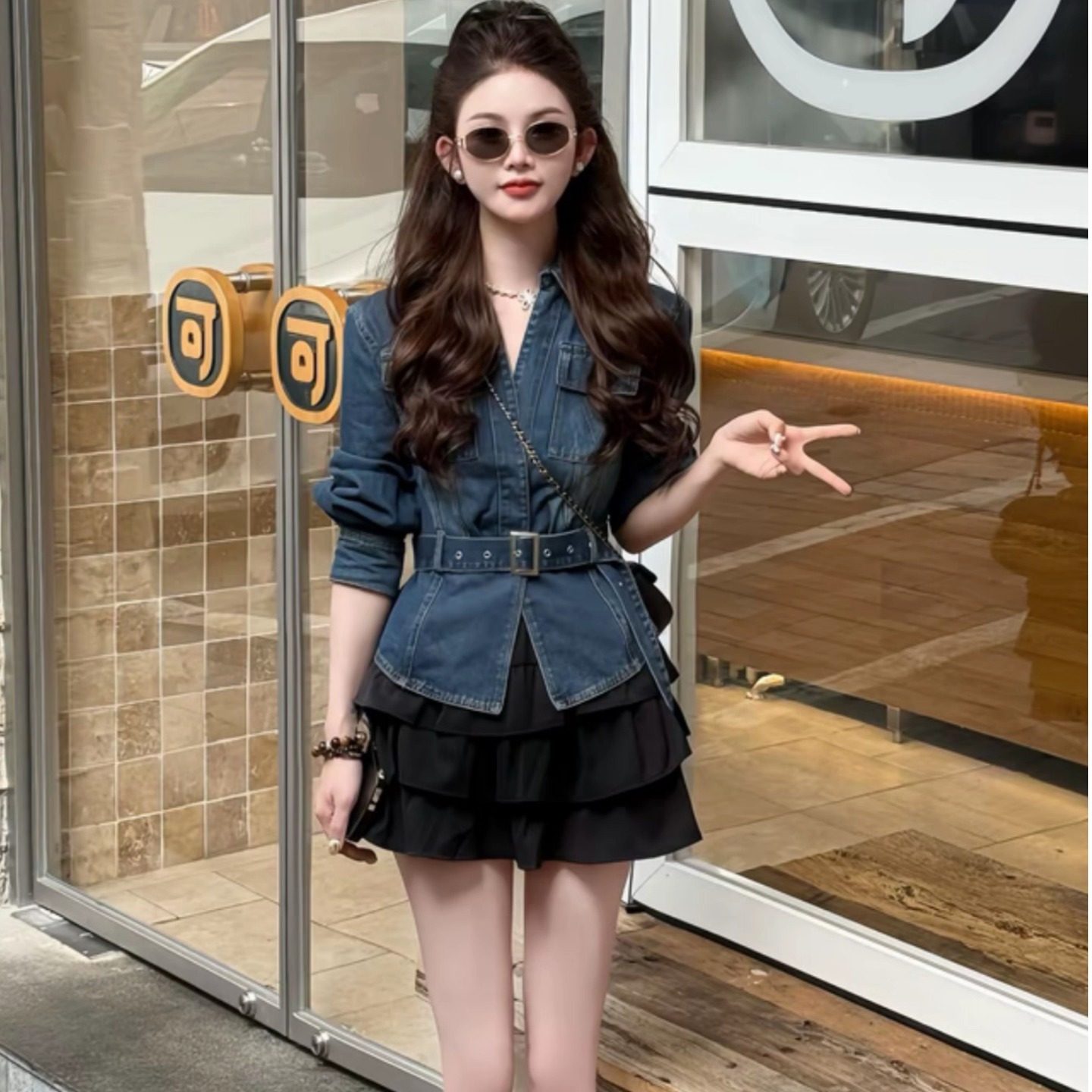 高级感套装女春秋季新款复古修身翻领收腰牛仔外套黑色蛋糕短裙潮