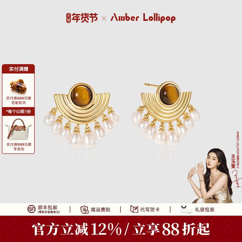 Amber Lollipop虎眼石耳钉女淡水珍珠扇形耳环气质流苏耳饰雅丹风
