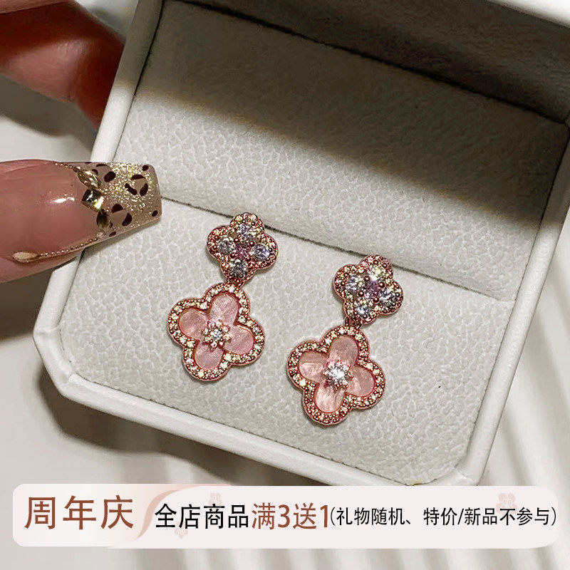 粉色四叶草通勤耳环女温柔气质百搭花朵耳钉小众高级感流苏耳饰品