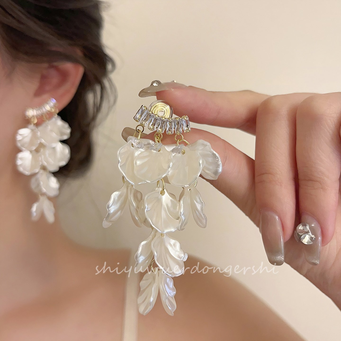 白色花瓣长款流苏耳饰时尚优雅气质高级感耳钉女蚊香盘耳夹无耳洞