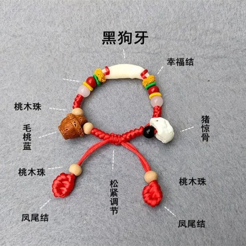 黑狗牙婴儿红绳手链宝宝防夜闹猪惊骨桃木桃篮儿童护身符朱砂手绳