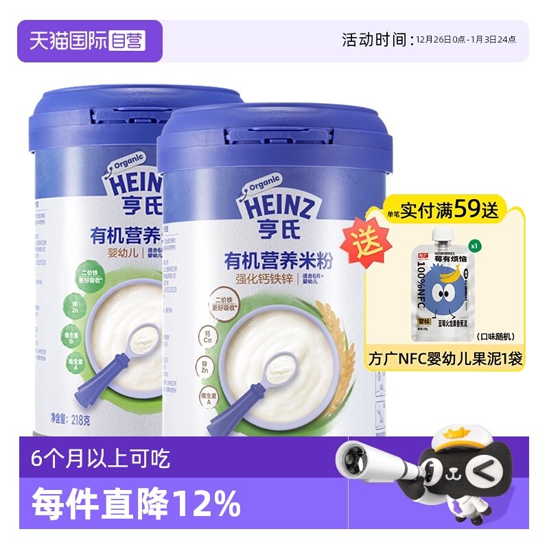 【自营】亨氏宝宝有机米粉婴幼儿6个月辅食钙铁锌营养米粉糊2罐装