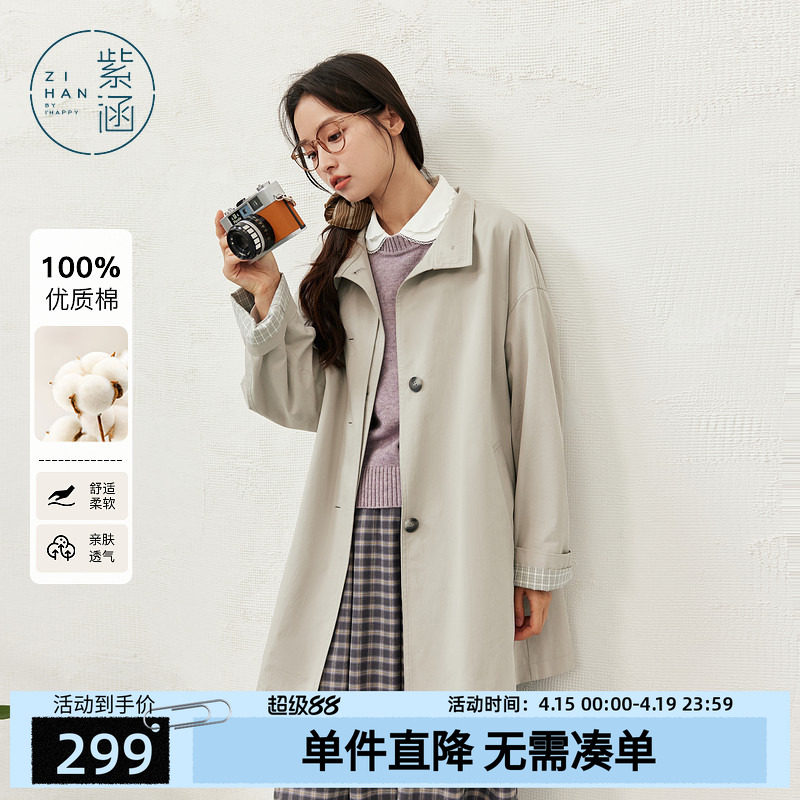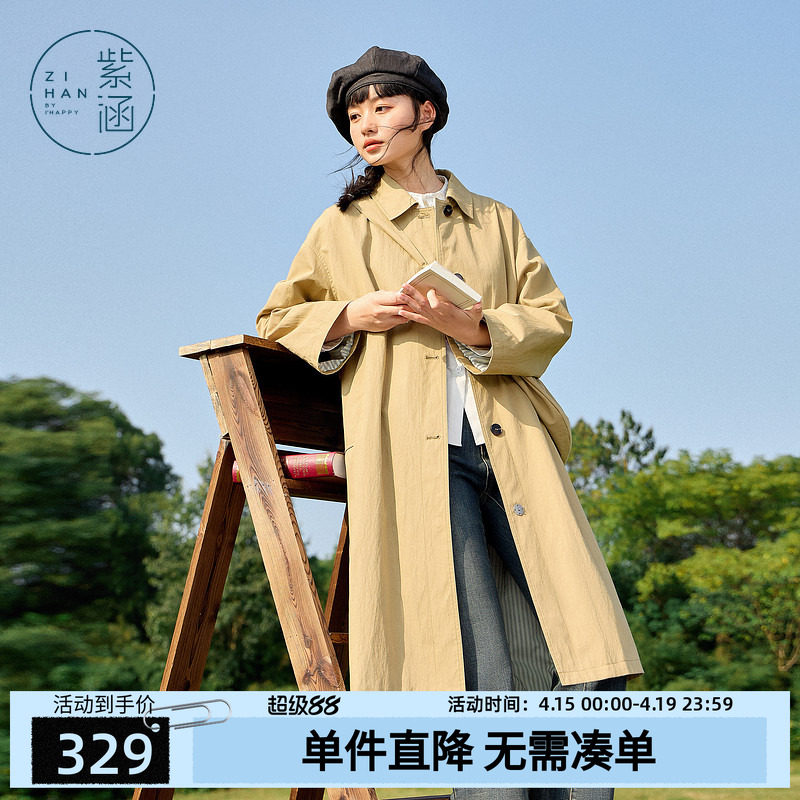 紫涵中长款直筒风衣外套女春秋新款休闲英伦风小个子宽松薄款大衣