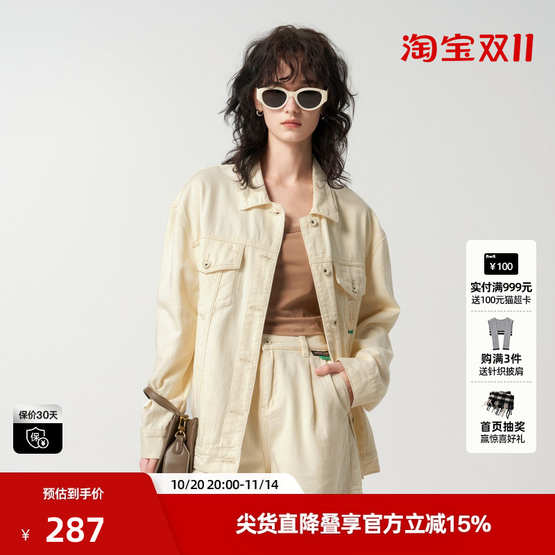 姜雯 简约宽松廓形白色牛仔外套女秋季纯棉水洗重磅工装夹克上衣