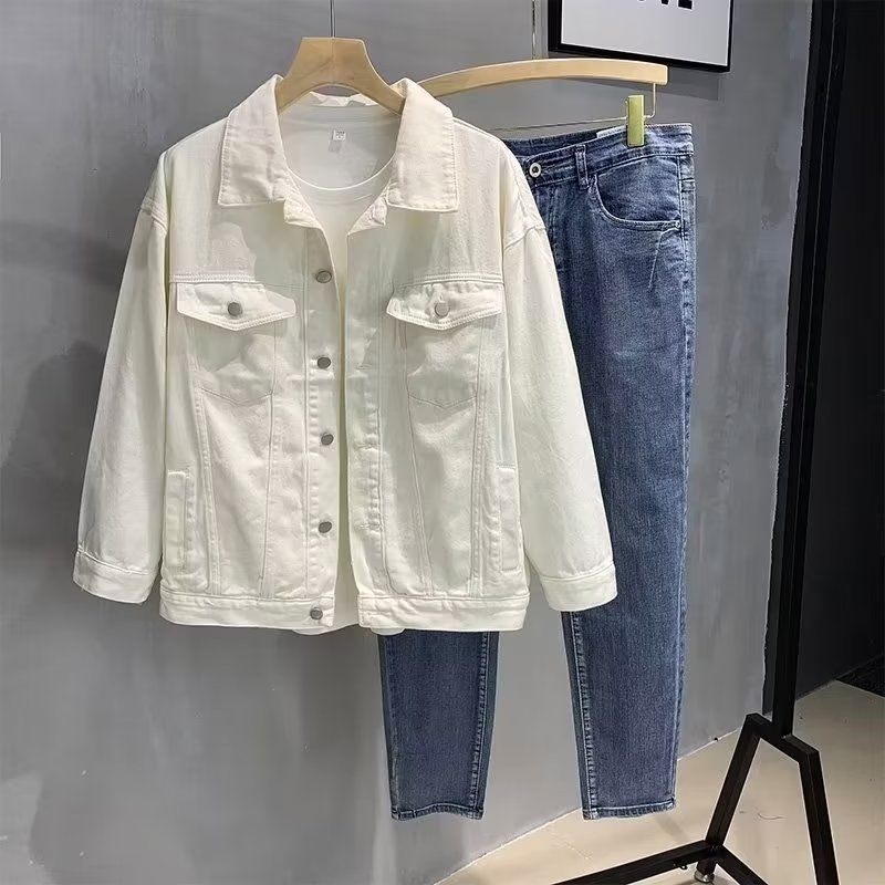 白色牛仔外套男士工装宽松春秋装青少年大码新款高级感帅气夹克男