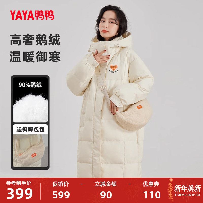 鸭鸭羽绒服女2024冬季新品中长款连帽时尚韩版休闲宽松鸭绒厚外套