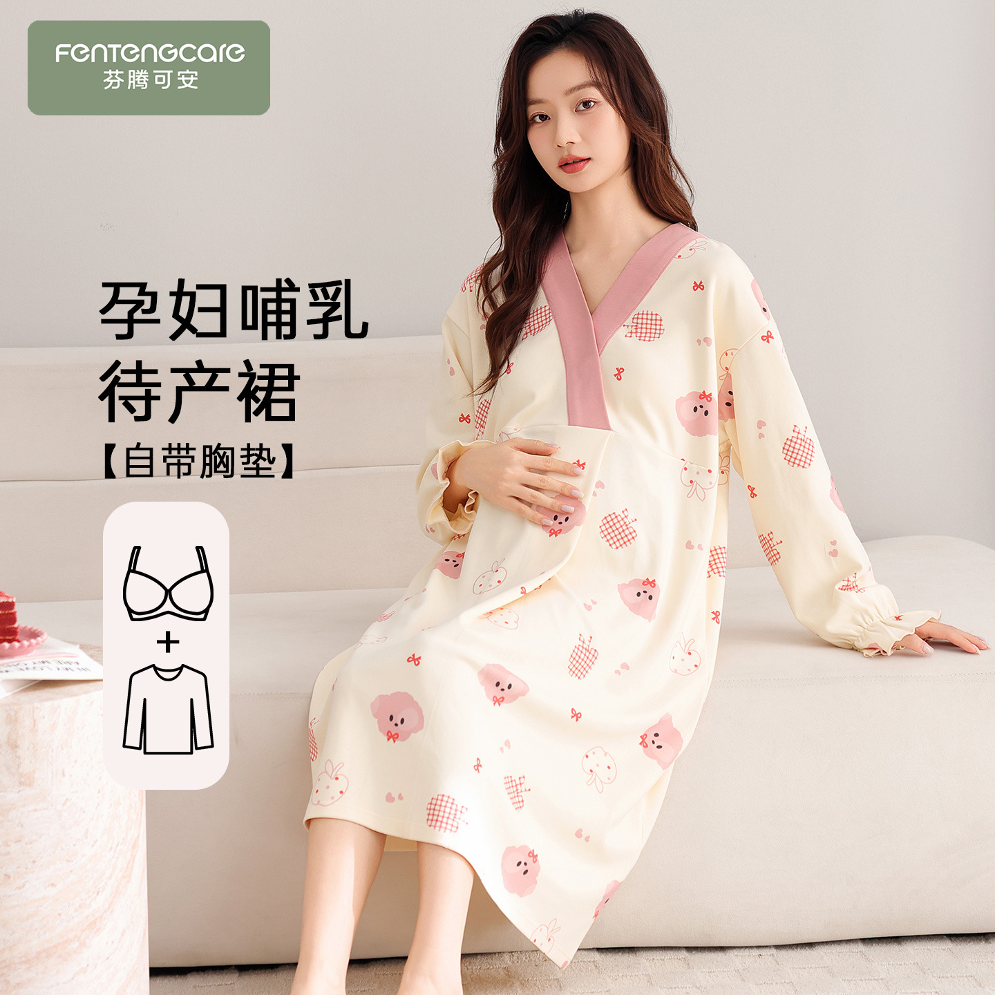 芬腾可安孕妇睡裙女款2025新款秋春季带胸垫哺乳浅粉待产裙月子服