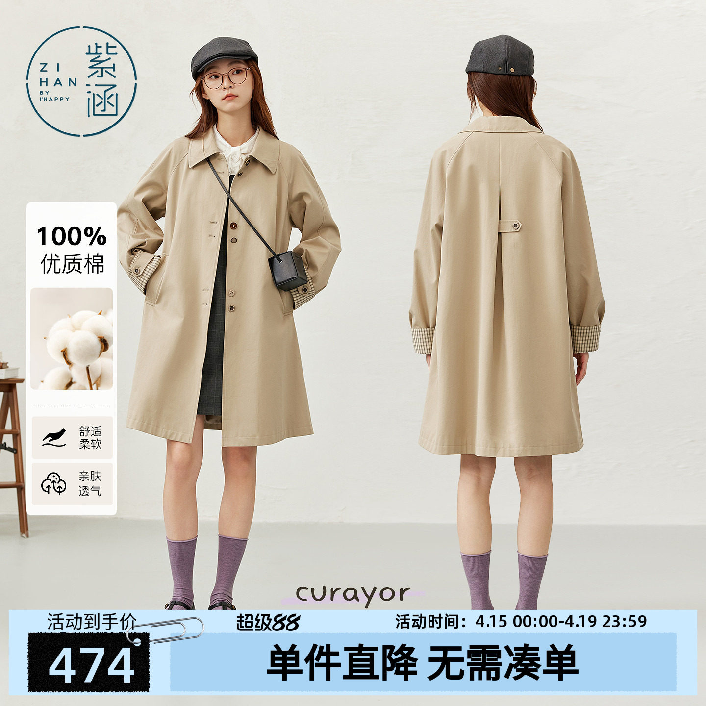 画风drawwind2026春季新款全棉纯色中长款单排扣小翻领风衣外套女