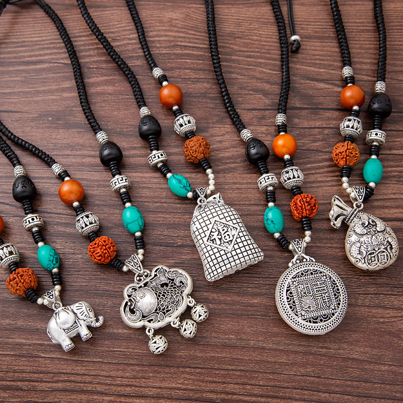 复古项链藏银配饰挂饰时来运转女锁骨链长款毛衣链棉麻配饰挂件潮