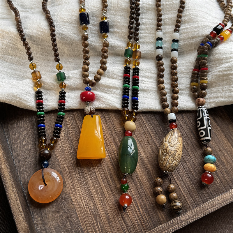 藏式复古民族风天珠蜜蜡吊坠木珠项链佛珠长款简约百搭毛衣链挂饰