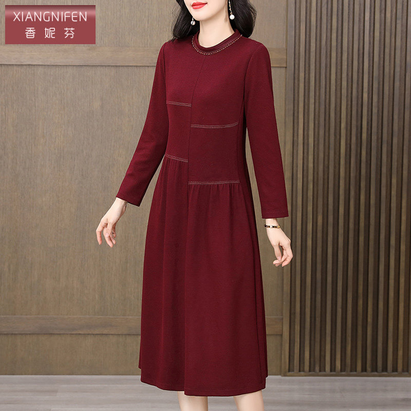 香妮芬红色洋气高贵阔太太妈妈连衣裙2025新款秋季长袖气质收腰裙