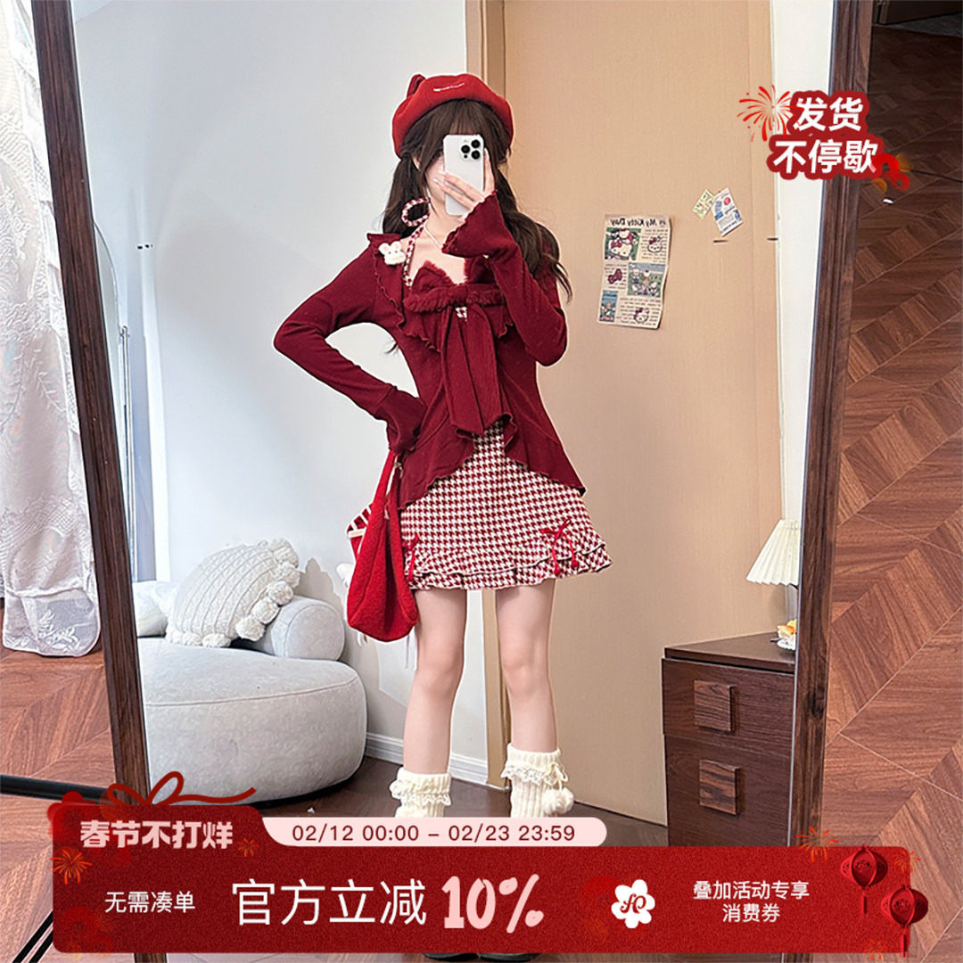 织物猪 甜樱少女 甜美风红色千鸟格挂脖连衣裙女新年穿搭长袖上衣