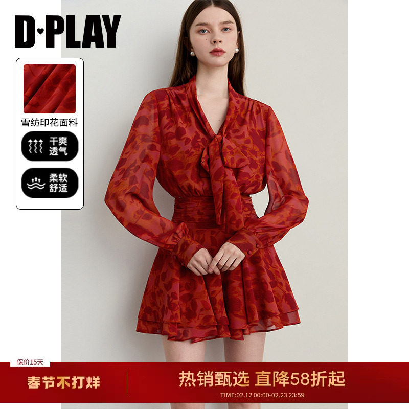 DPLAY红色连衣裙女修身春季新款短款好看法式裙子收腰长袖短裙