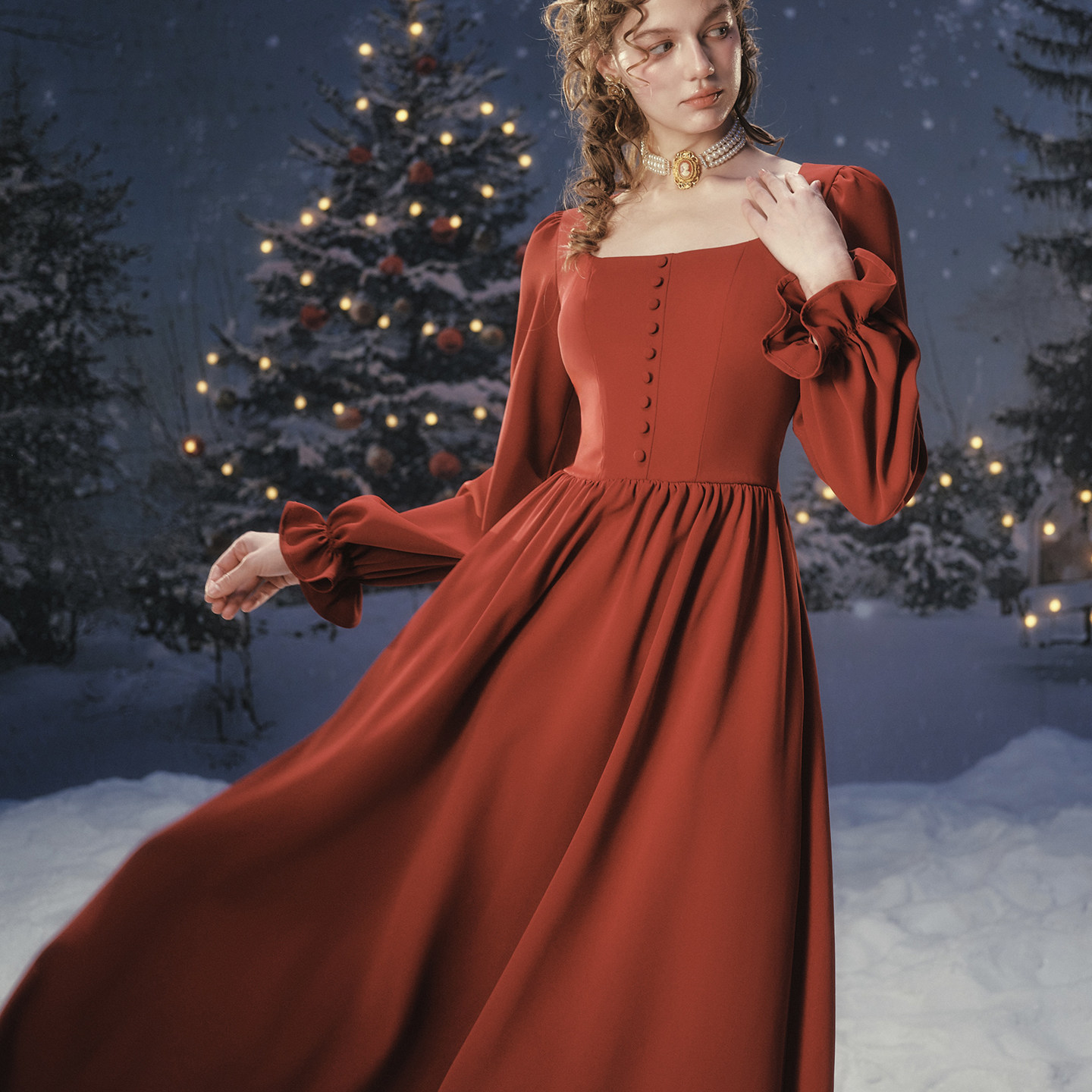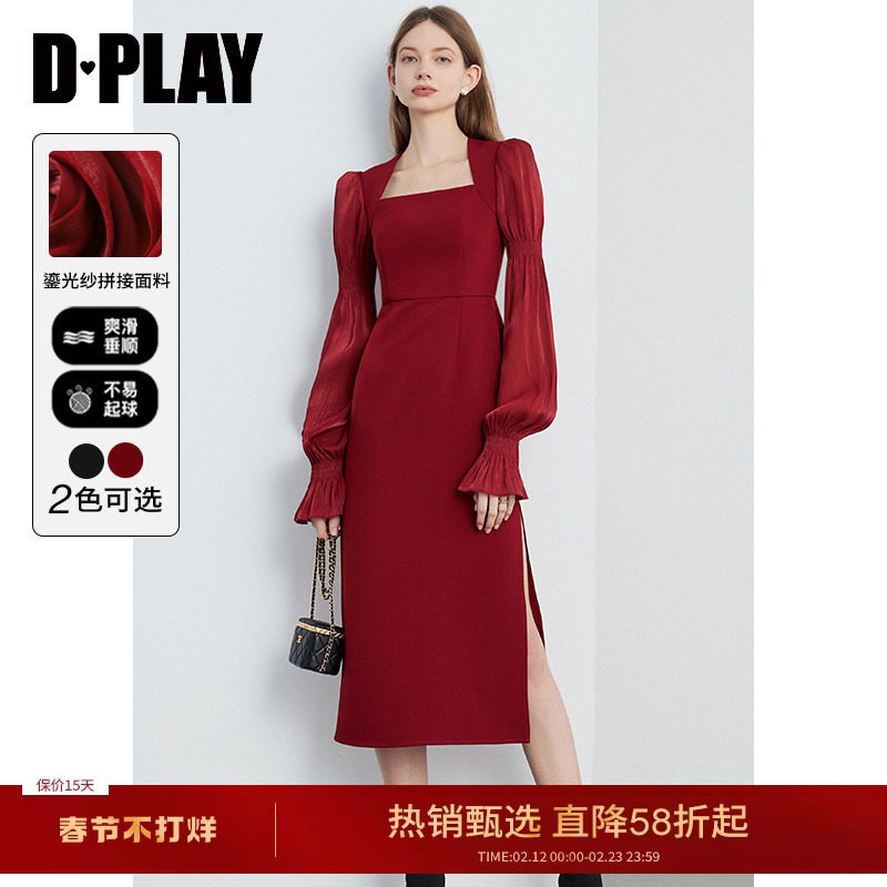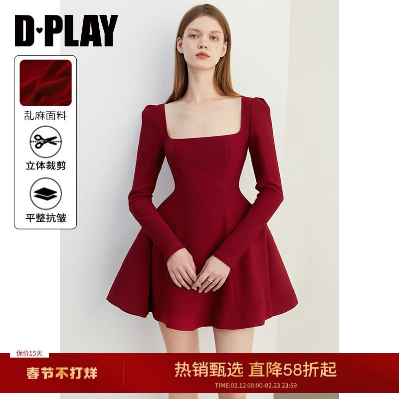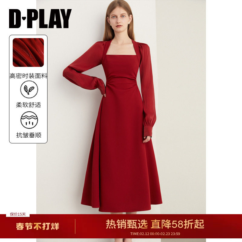 DPLAY2026春季红色连衣裙女法式方领长袖敬酒订婚礼服裙子长裙