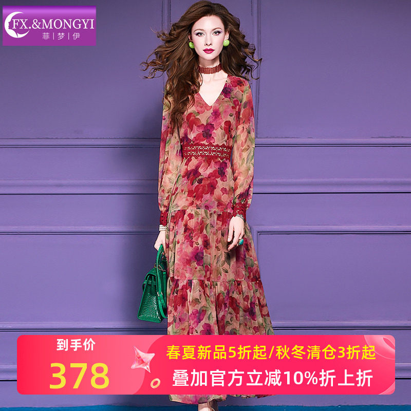 菲梦伊印花红色连衣裙女长袖春季法式轻熟气质女人味收腰V领长裙