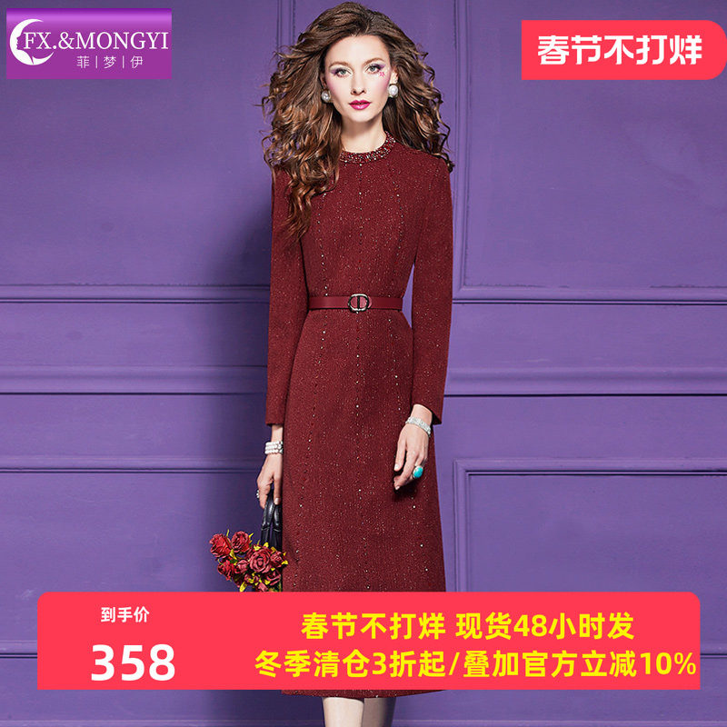 菲梦伊钉珠红色连衣裙女长袖秋装新款小香风名媛端庄气质A字裙子