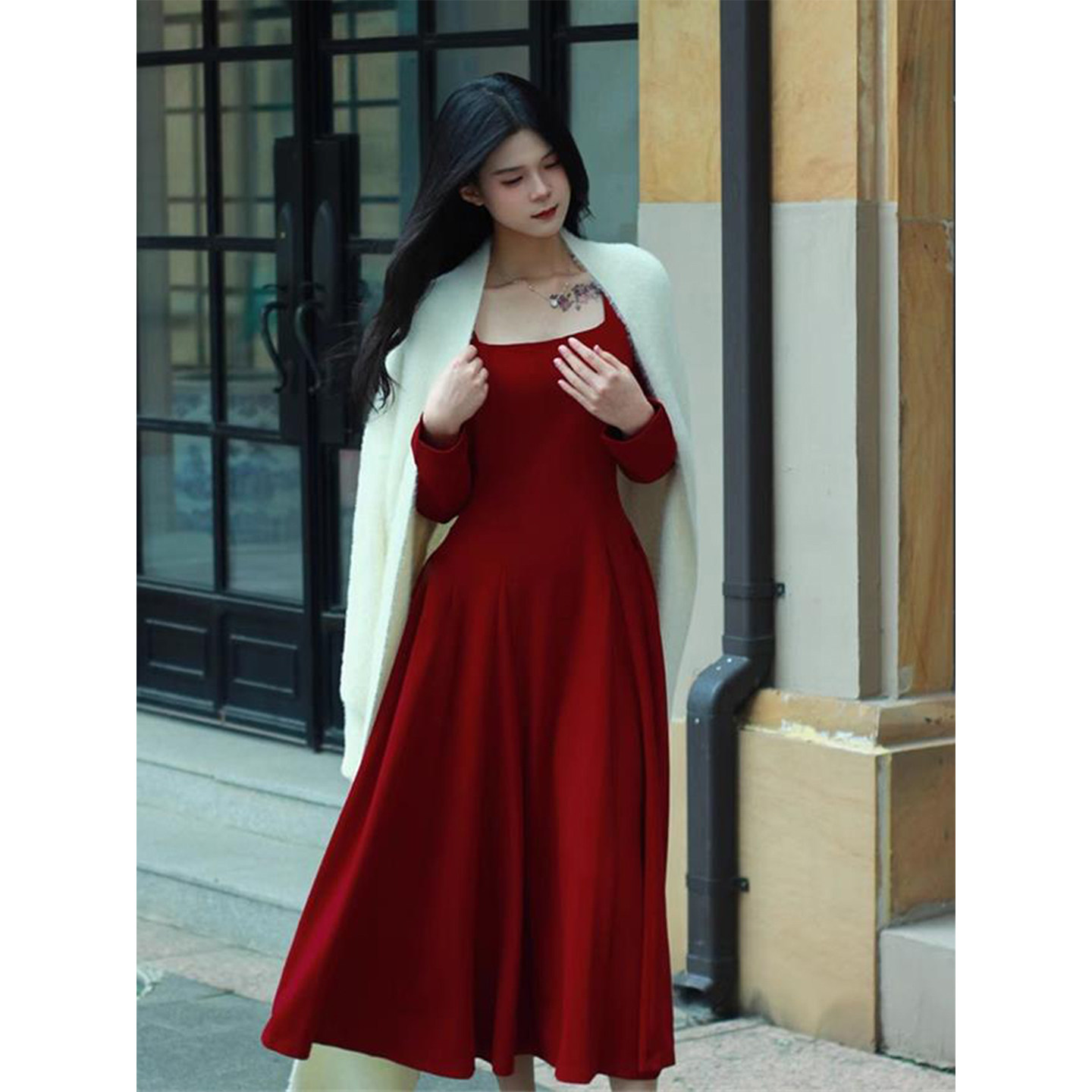 - 红色长袖连衣裙