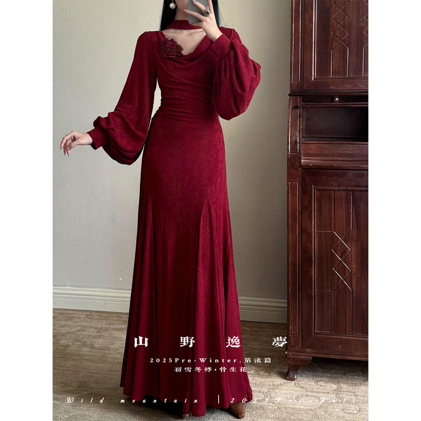 山野逸梦红色长袖希腊女神秋冬优雅气质订婚圣诞敬酒年会服连衣裙