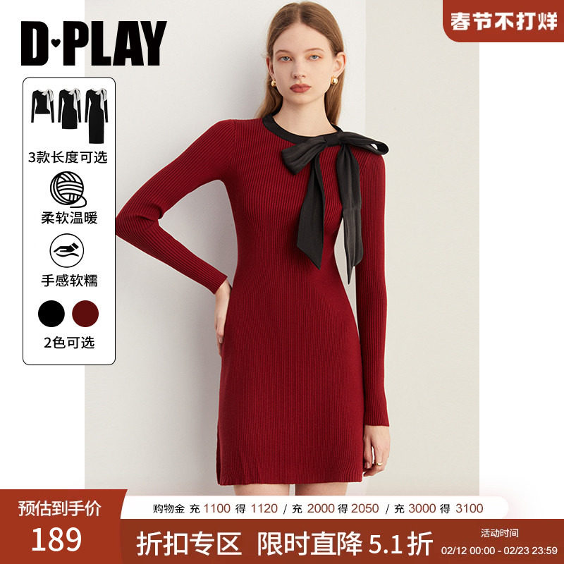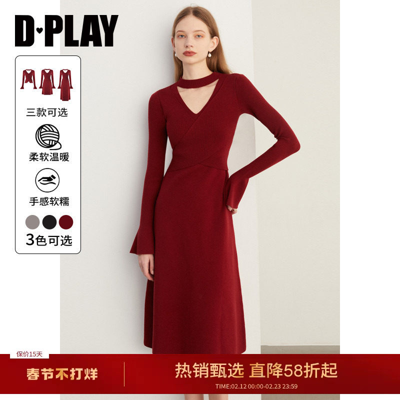 DPLAY新年红色针织连衣裙长袖气质修身订婚毛衣裙长裙女2026年春