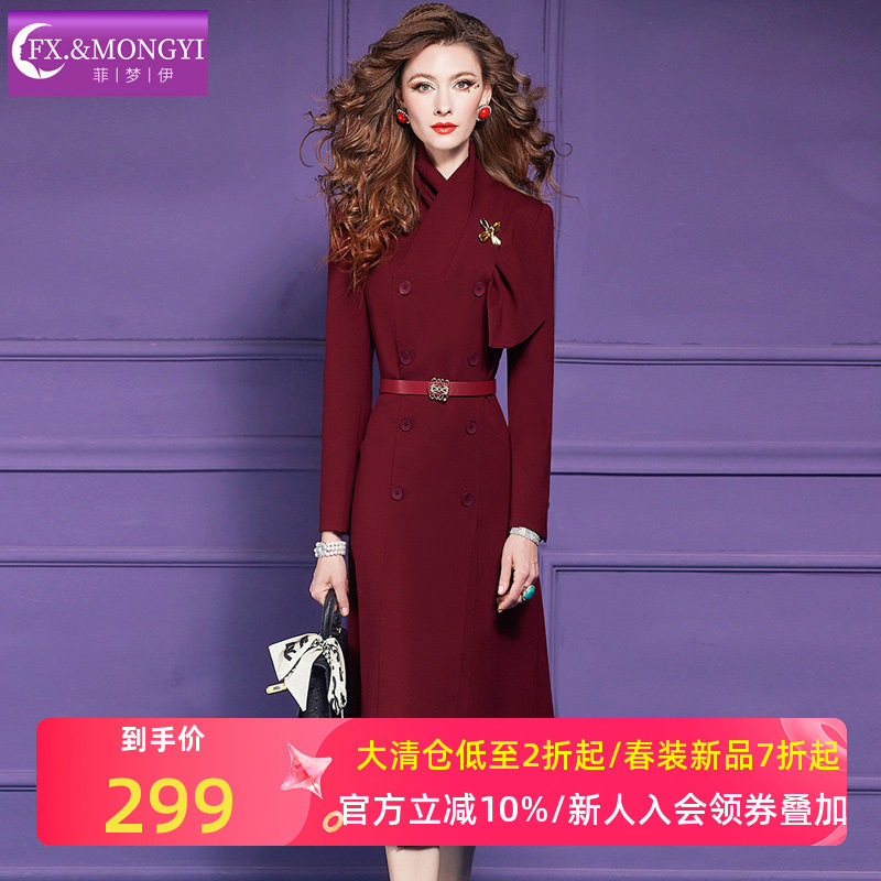 菲梦伊红色连衣裙女长袖秋装别致设计感修身双排扣气质中长款大衣