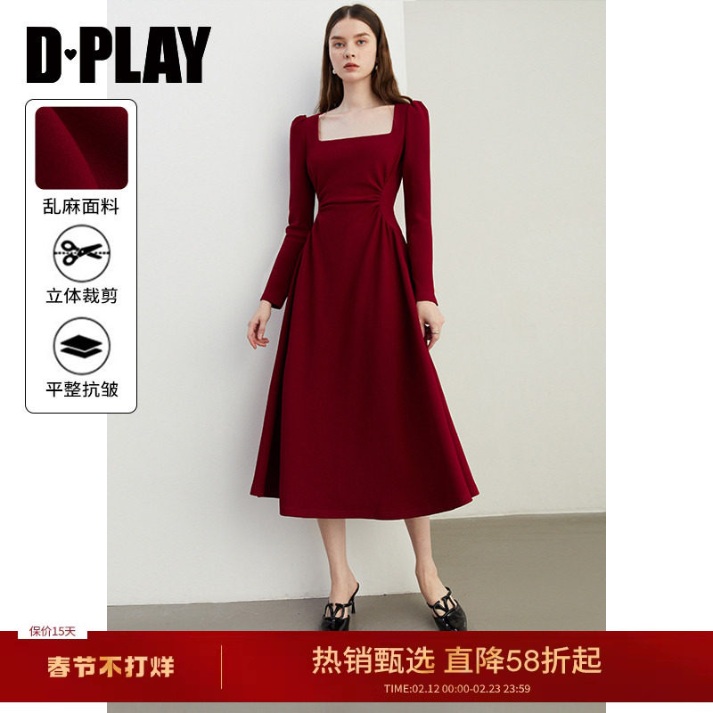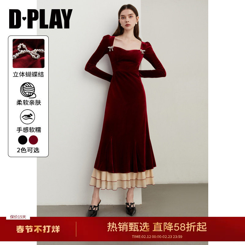 DPLAY2025冬季新款法式方领丝绒红色连衣裙女订婚礼服长裙长袖