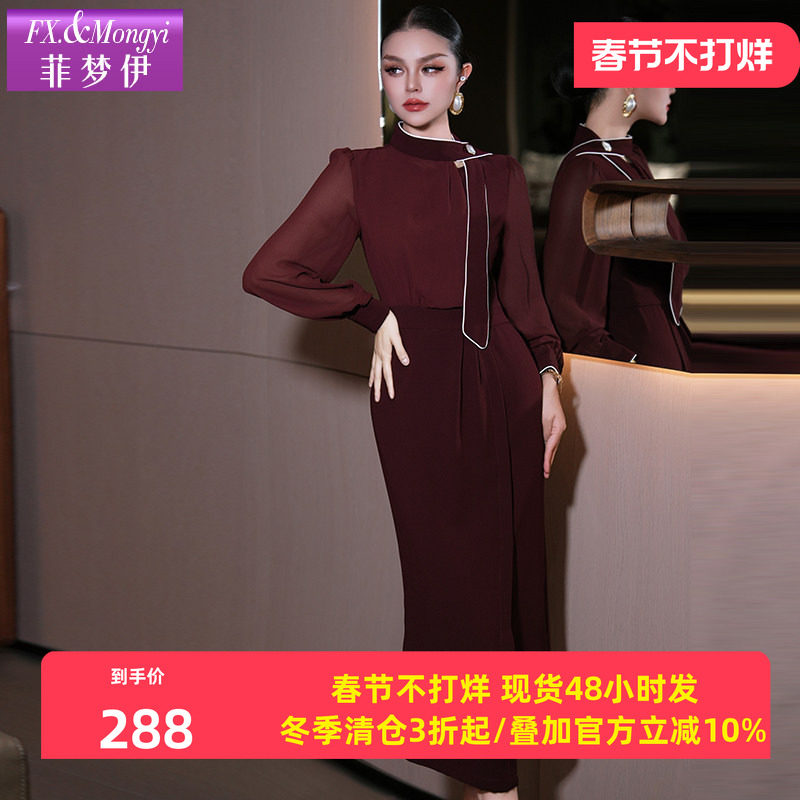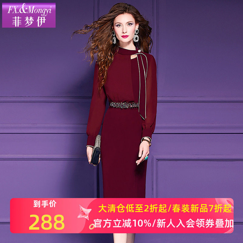 菲梦伊红色连衣裙女长袖秋装法式高级感轻熟高端气质鱼尾裙子礼服