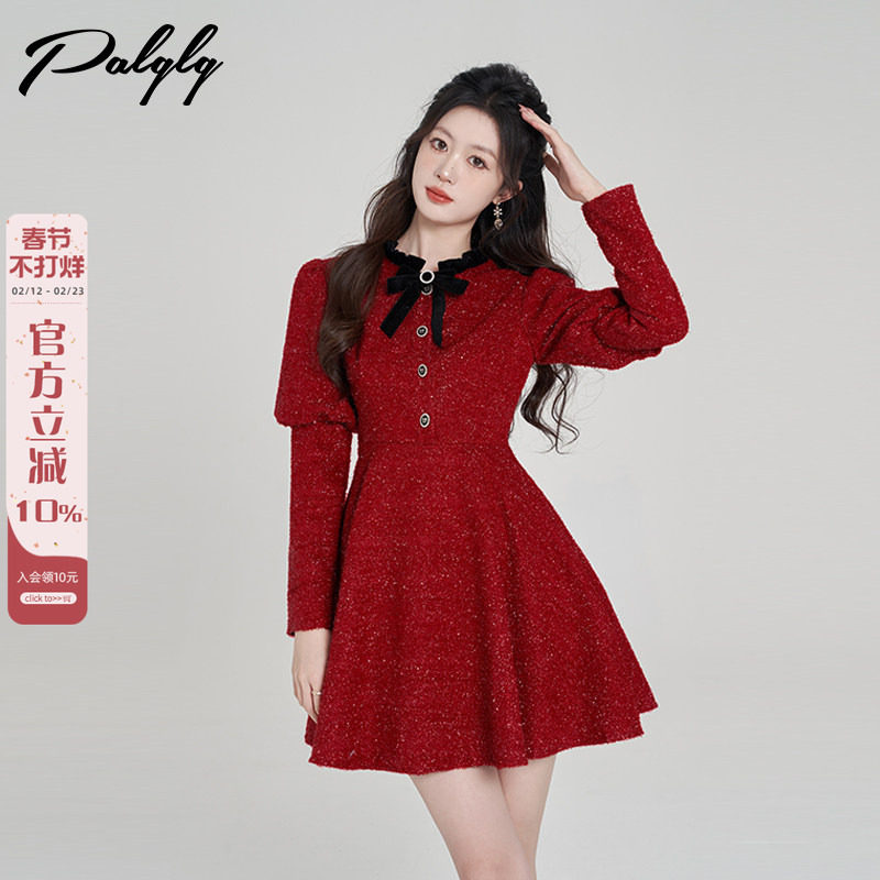 红色泡泡袖长袖连衣裙2026秋冬新款法式小个子收腰显瘦高级感裙子