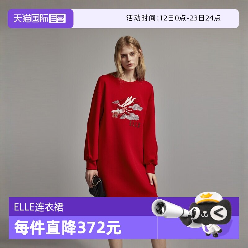 【自营】ELLE龙年印花红色长袖连衣裙女2026春装新款气质裙子长裙
