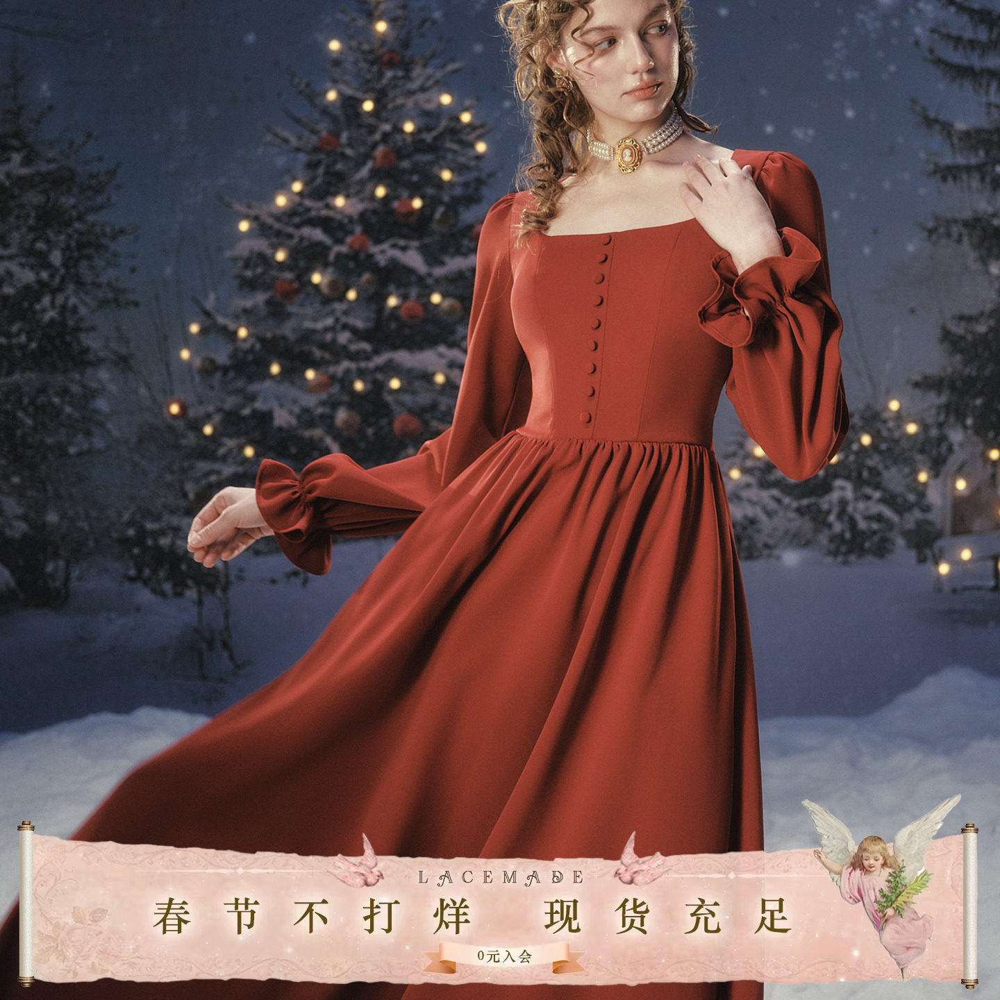 LaceMade 浓情波尔多 法式复古通勤长款红色长袖连衣裙敬酒服冬季