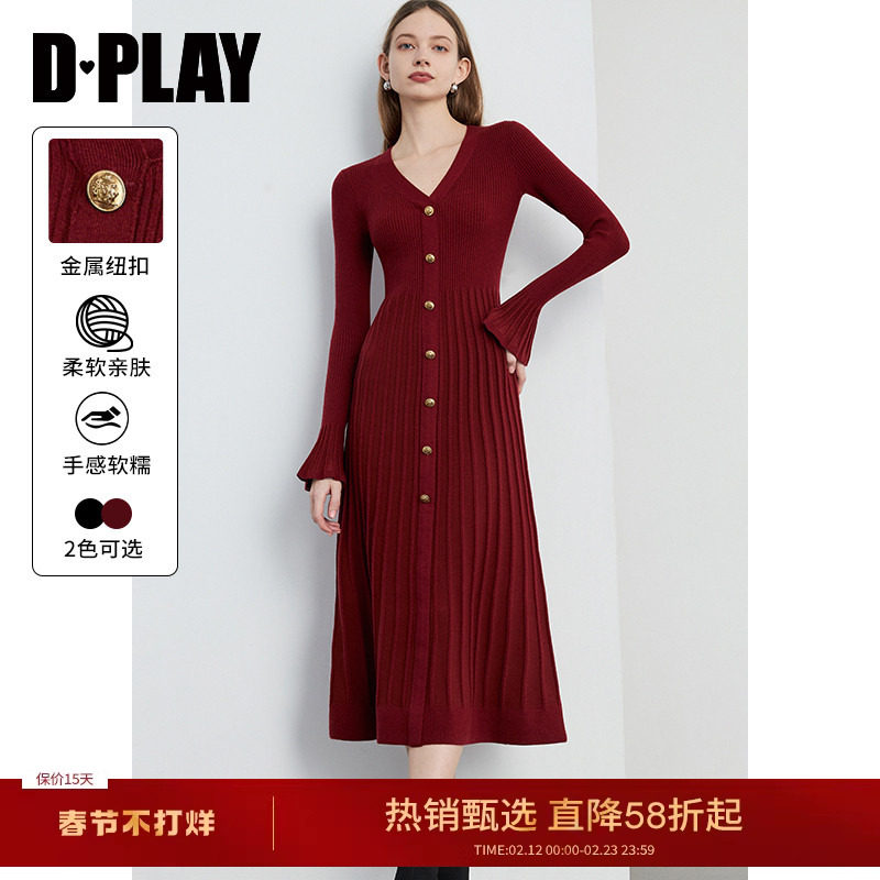 DPLAY2026年春季新款气质V领红裙长袖红色连衣裙女针织订婚长裙