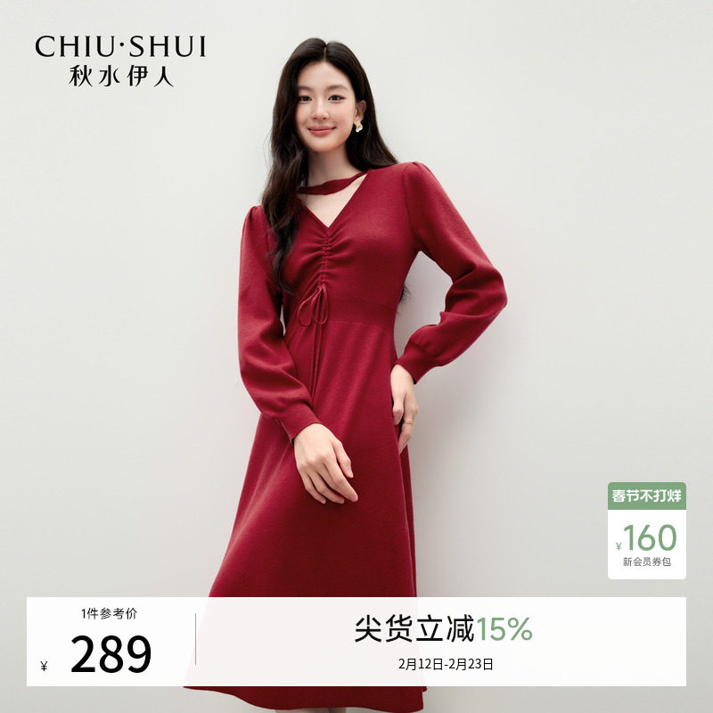 长袖收腰设计连衣裙2025年冬季新款女装通勤时尚优雅温柔红色裙子
