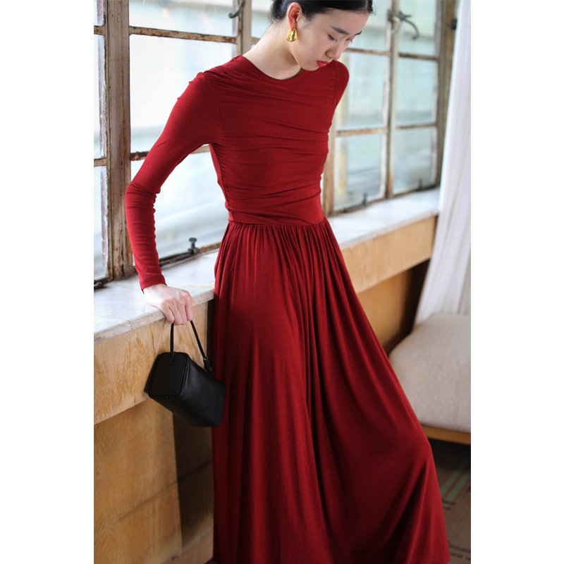 无有无印红色舒适长袖圆领抽皱大摆长款显瘦针织连衣裙23316